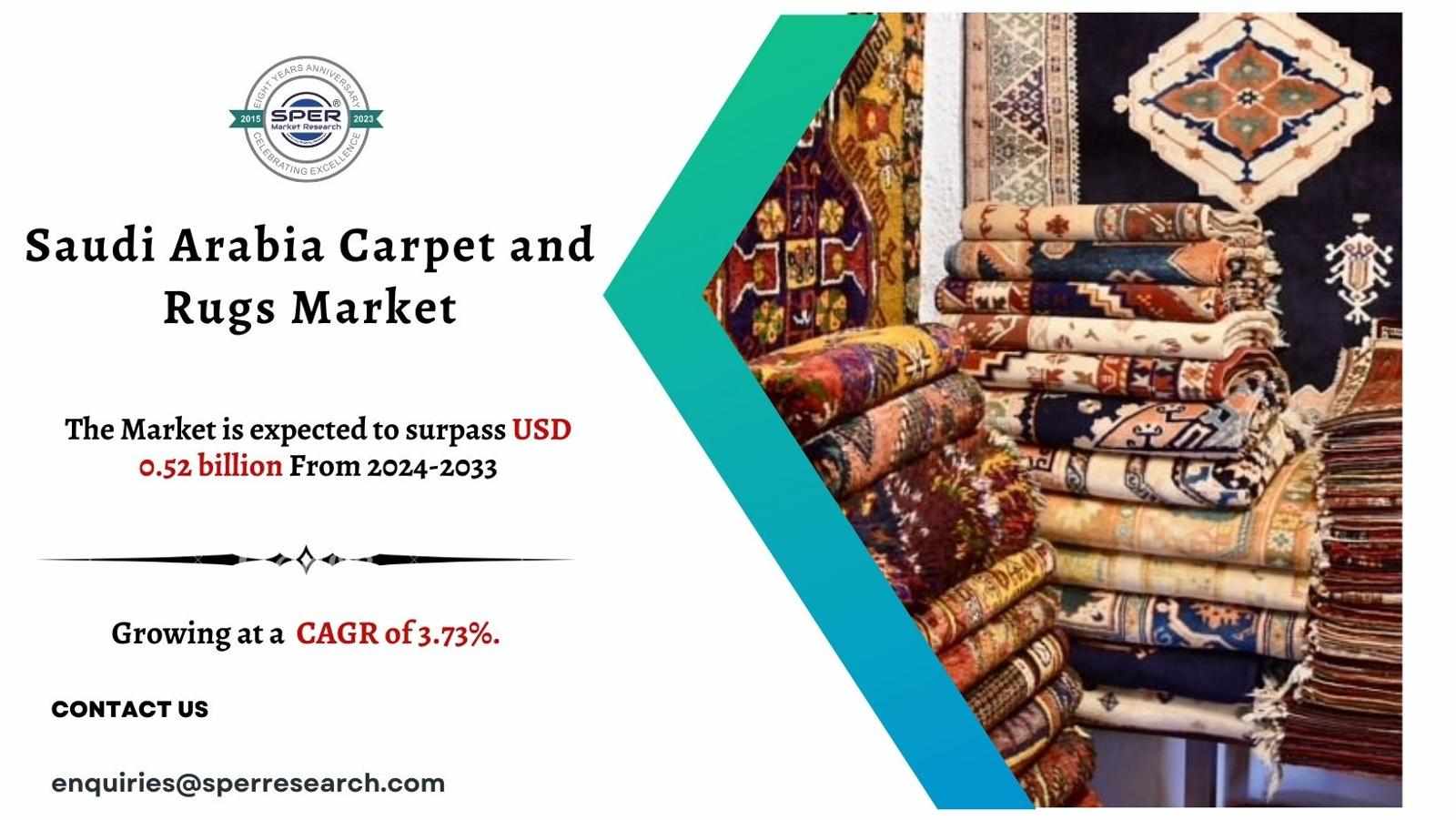 According to SPER market research, ‘Saudi Arabia Carpet and Rugs Market Size- By Type, By Application, By Distribution Channel- Regional Outlook, Competitive Strategies and Segment Forecast to 2033’ state that the Saudi Arabia Carpet and Rugs Market is estimated to reach USD 0.52 billion by 2033 with a CAGR 3.73%.